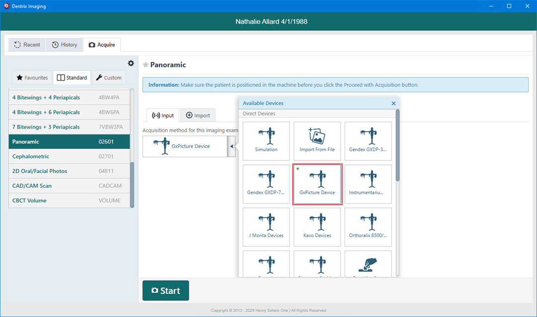 3. In the Acquisition method for this imaging exam list, click GxPicture Device, and then click Start.