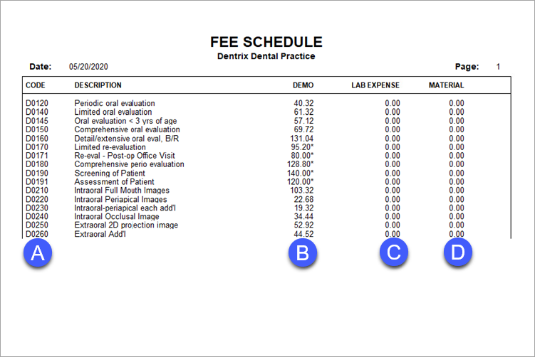 The Fee Schedules Report lists procedure fees for a selected fee schedules. This report also lists the lab expenses and material expenses associated with each procedure.