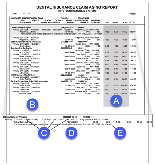 In the Office Manager from the Reports menu, point to Ledger, and then click Insurance Aging Report. For additional details about running this report, see the Dentrix Help (in the Office Manager from the Help menu, click Contents).