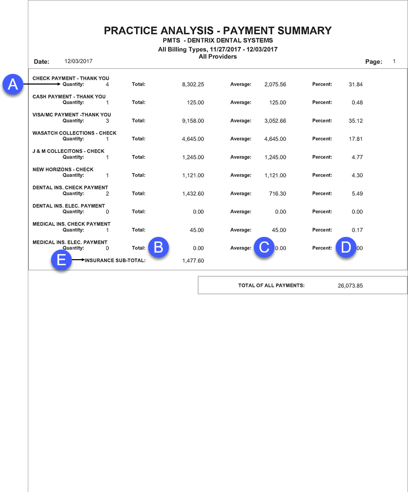 In the Office Manager from the Reports menu, point to Management, and then click Practice Analysis Report. Select Payment Summary, and then click Batch or Print. For step-by-step instructions on how to run this report, see the Dentrix Help (in the Office Manager from the Help menu, click Contents).