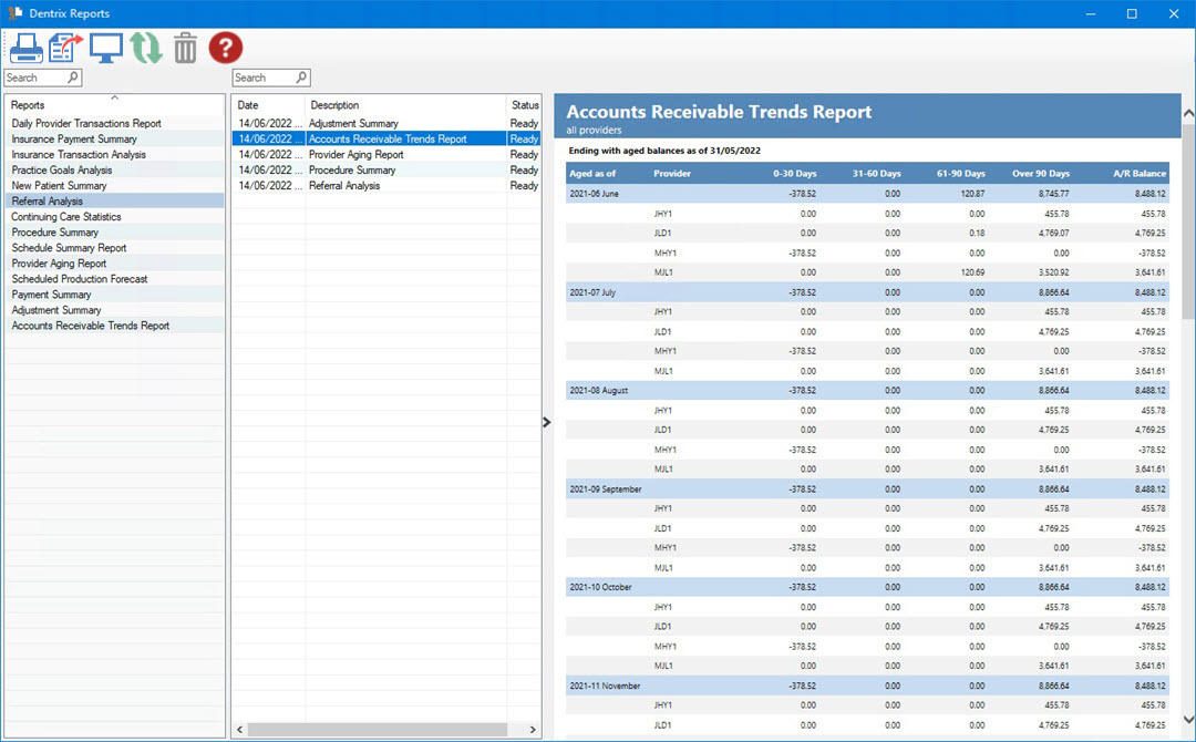 You can print, export, or delete the reports that you run in Dentrix Reports.