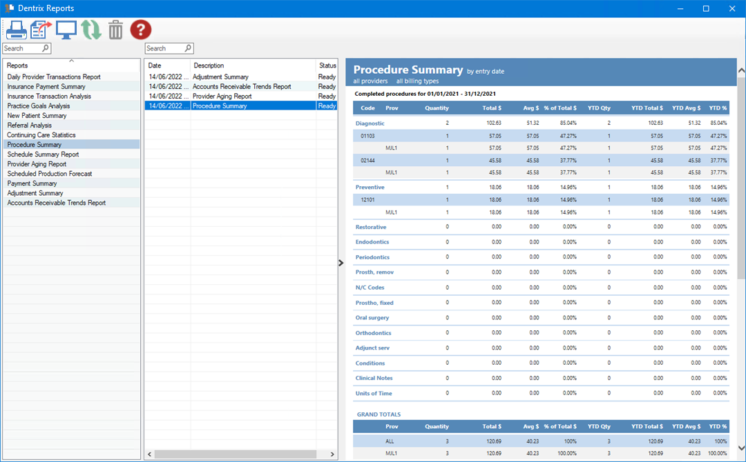 A Procedure Summary includes summaries of the quantity, percentage, and total production of the selected procedure code categories by provider. You can preview, print, or send via email previously generated reports at any time after you have generated them.