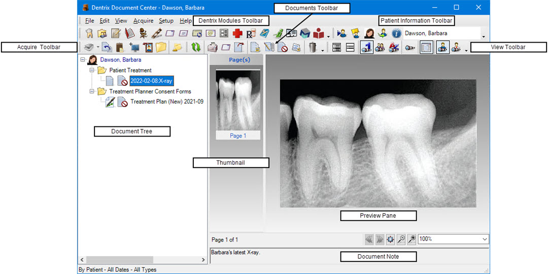 The Document Center window includes several tools and features to help you manage documents such as patient letters, EOBs, referral letters, and images (such as patient pictures and X-rays) that are scanned, captured, and imported. These tools and features include:
