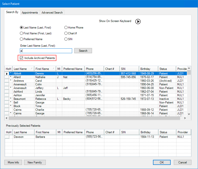 If archived patients return to your practice, you can reactivate them and restore all address, procedures, insurance claims, payments, adjustments, medical alerts, prescriptions, patient questionnaires, and periodontal exams.