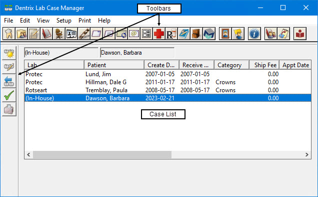 The Lab Case Manager consists of a menu bar and two toolbars. The toolbar under the menu bar contains buttons that can be found in other Dentrix modules. The Lab Case Manager toolbar down the left side of the Lab Case Manager window contains buttons that are specific to the Lab Case Manager.