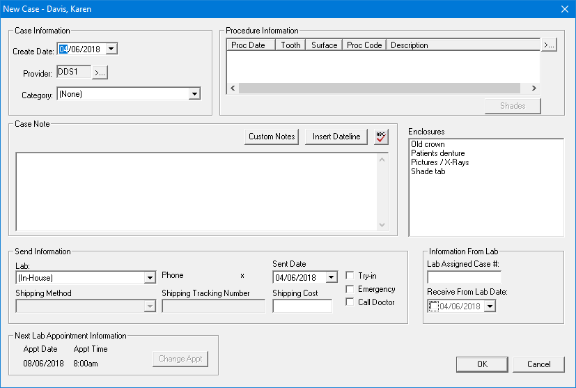 Information From Lab - Type the case number and select the date that you expect to receive the case from the lab. If the lab is an Internet lab, the case number is entered automatically.