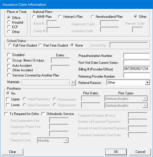 Note: When you enter or clear claim information in a Claim window, the changes only apply to the currently displayed claim and the associated primary or secondary claim. When you create a new claim, the claim information uses the defaults for the current patient. You can change the defaults for the patient through the Appointment Book. For more information, click Scheduling appointments.