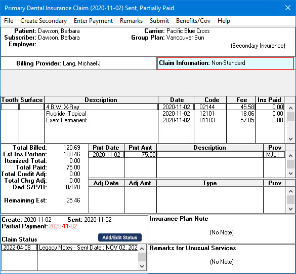 The Claim Information block displays information that is specific to a patient and an insurance claim. The standard information prints on the claim unless you have edited it.