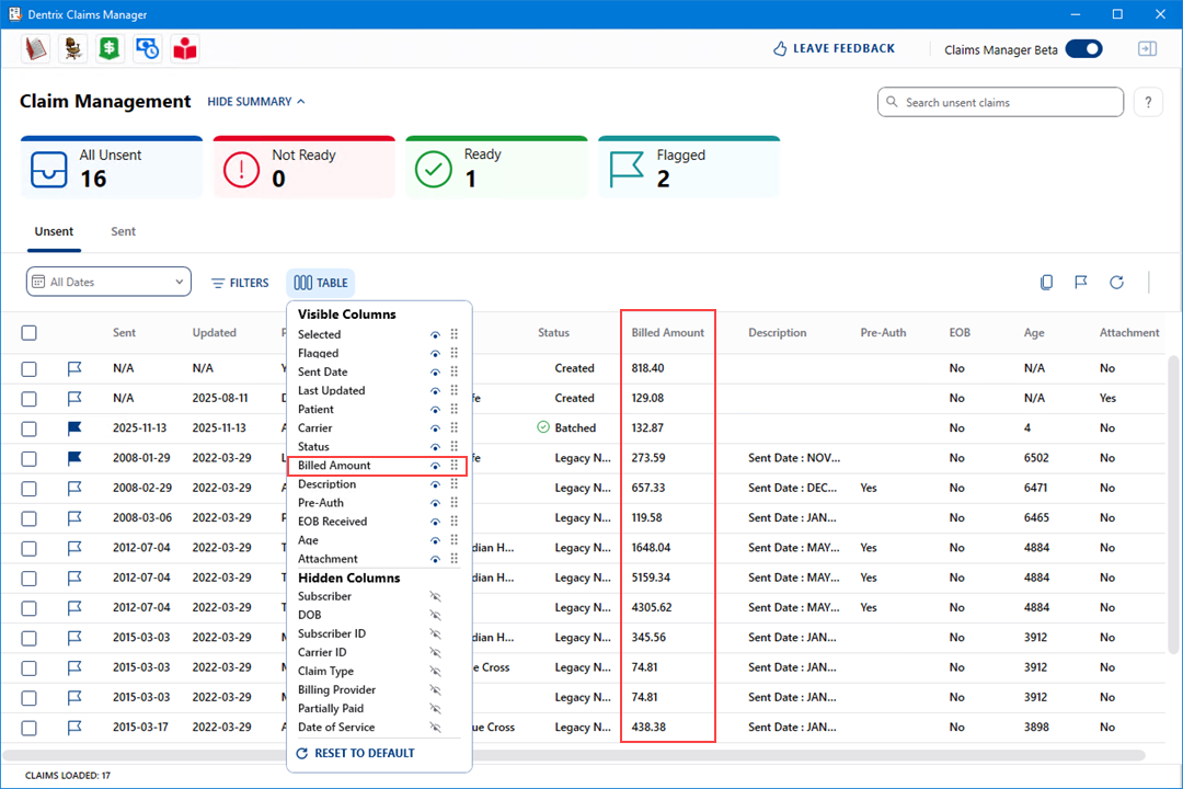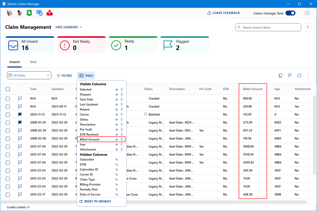 By default, ten columns are visible in the claims list of the Claims Manager. To better meet the needs of your practice, you can customize the Claims Manager by hiding, showing, or rearranging the columns in the claims list.