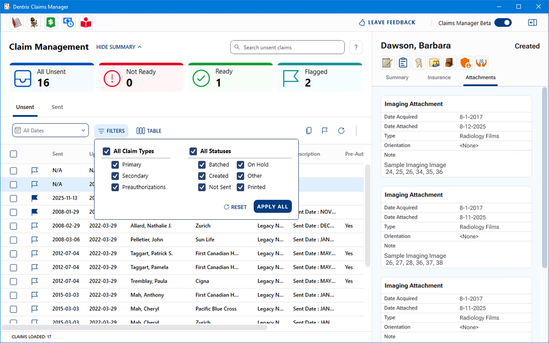 3. To filter the claims list by unsent or sent status, click the Unsent or Sent tabs.