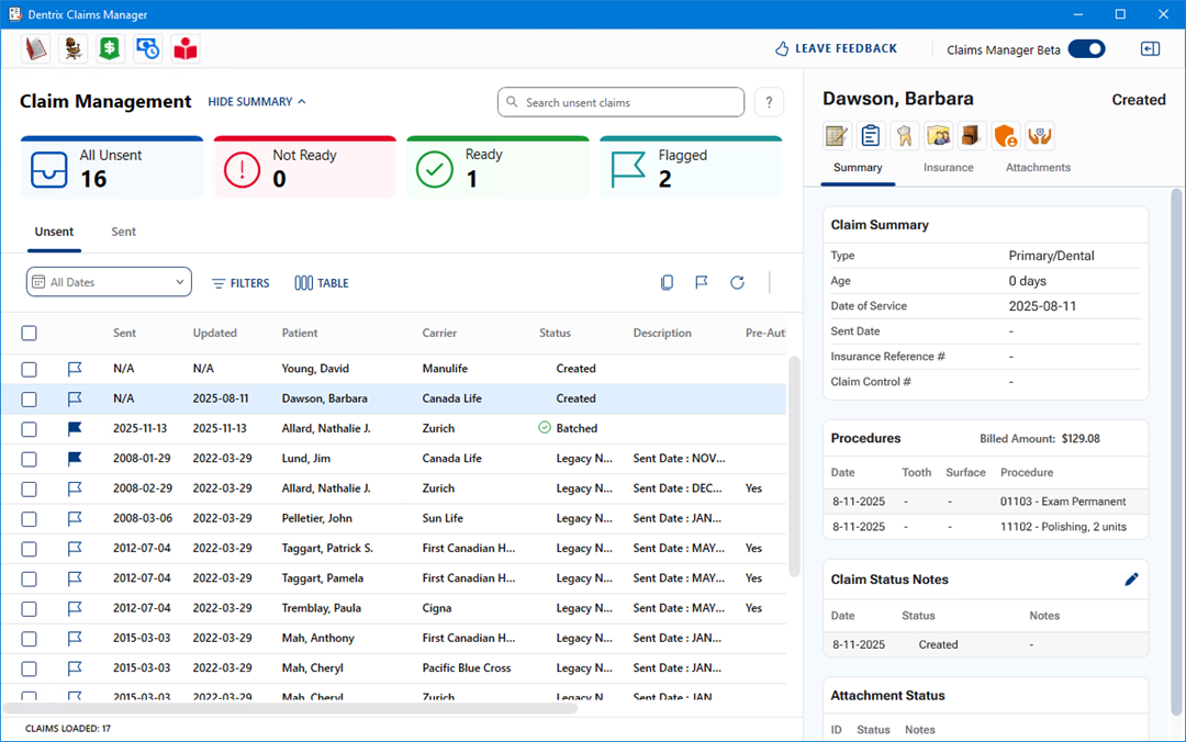 The details of the selected claim appear in the side panel, click the Summary, Insurance, or Attachments tabs for more detailed views.
