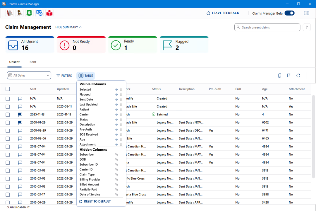 In the Claims Manager, you can search for claims by date, date range, or column. You can also re-sort the claims list by clicking the column name.