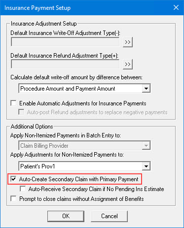 You can create a secondary claim automatically whenever you post a primary insurance claim payment if you have not already created a secondary claim and if a patient has secondary insurance set up in the Family File.