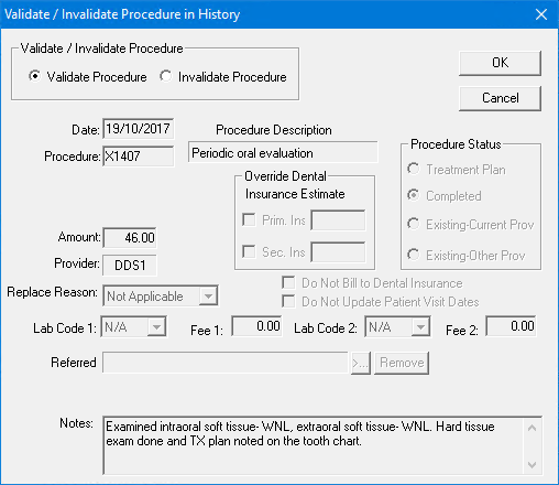 In contrast, the Patient Chart serves as a clinical record of patient care and must be completely accurate. You must correct any errors so that the Patient Chart reflects the actual care given. To solve this discrepancy, you can invalidate procedures in history. Invalidating a procedure removes it from the Patient Chart, while leaving it on the Ledger. If you discover a posting error after a procedure has been moved to history, you can invalidate the procedure in history to correct the mistake.