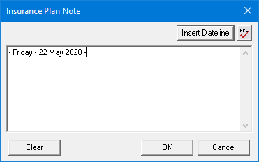 Insurance plan notes apply to insurance carriers and do not print on insurance claims. Any changes you make to an insurance plan note apply to every patient covered by the same insurance plan.