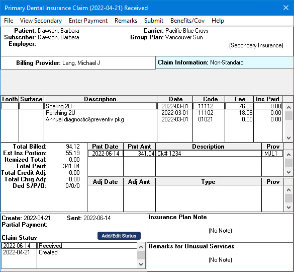 The Primary Dental Insurance Claim Received window appears.