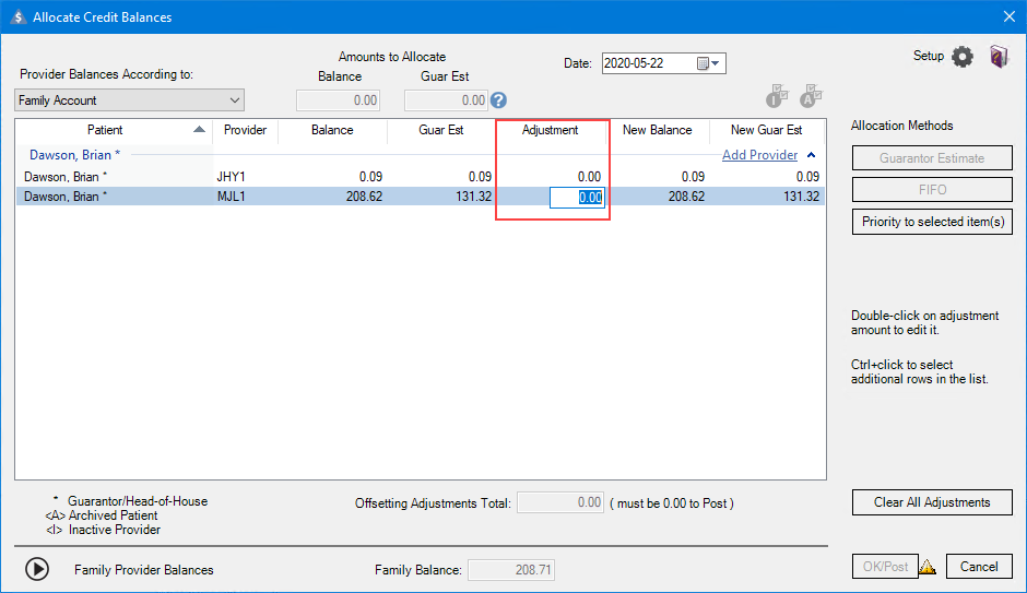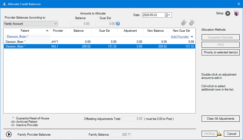 Occasionally, patients may have a credit balance that they need to apply to a procedure. You can allocate credit balances to specify which providers should receive part of an over-payment or a credit after procedures have been entered. You can also transfer patient/provider balances within a family without affecting the aging of the account. You can view and adjust family member and family account balances by provider without changing views in the Ledger. You can easily transfer balances from archived patients and inactivated providers.