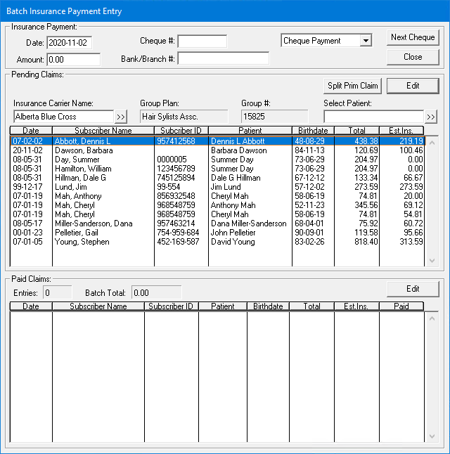 The Batch Insurance Payment Entry dialog box appears.