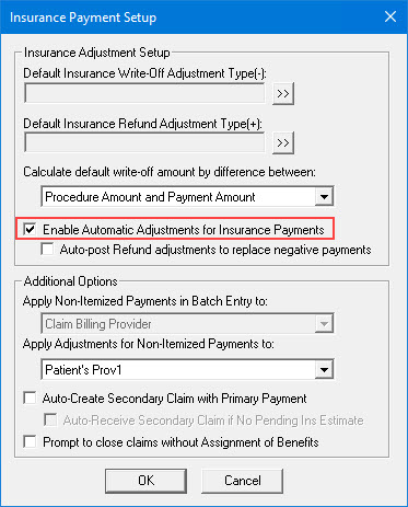 By selecting this option, you can post refund adjustments automatically instead of entering negative insurance payment amounts.