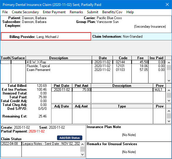1. From the Ledger transaction log, double-click an insurance claim or payment or a pre-authorization estimate.