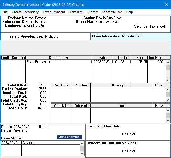 Important: Avoid exiting the Primary Dental Insurance Claim window without batching, sending, or printing a claim to prevent the claim from staying on the account without getting submitted.