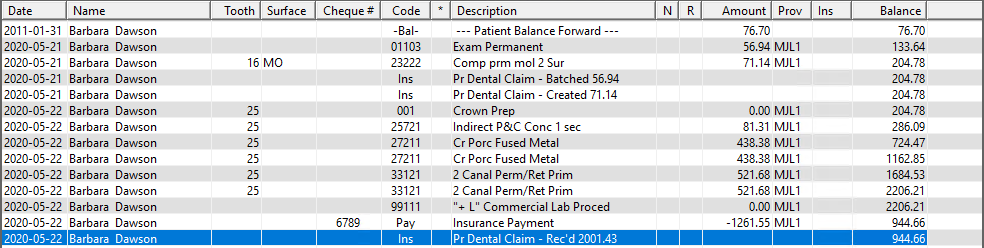 From the Transaction Log, you can quickly determine the status of a procedure or claim. The Ins column indicates whether you have billed a procedure to insurance. If the column is empty, the listed procedure is attached to an insurance claim. If “No” appears in the Ins column, you have not created an insurance claim.