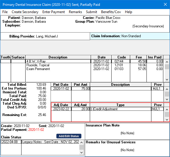 You can view and modify claim adjustments from the Adjustments block in the Primary Dental Insurance Claim window.