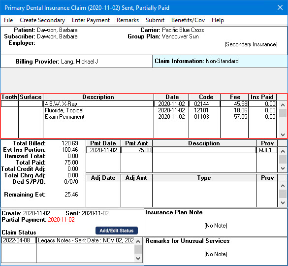 The Procedure Information block lists all of the procedures attached to a claim, including the tooth number, surface, description, date, procedure code, fee, and amount paid.