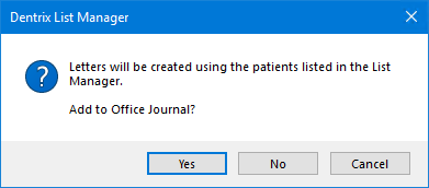 Dentrix opens Microsoft Word, creates a letter for every patient listed in the List Manager, and creates an entry in the Office Journal.