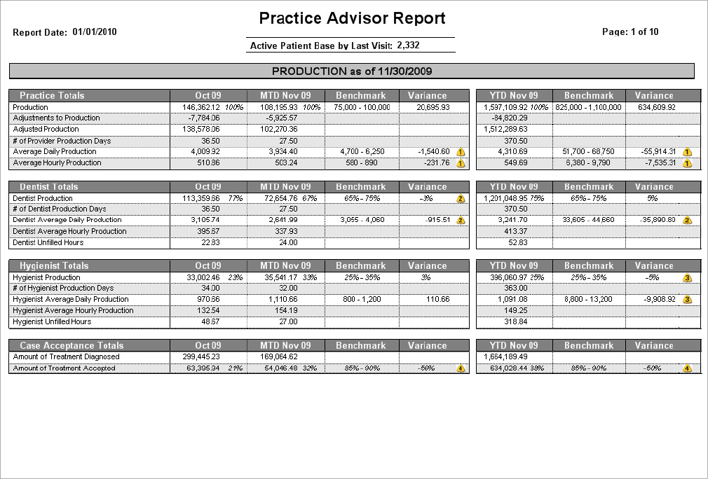 The Practice Advisor Report helps you to assess the overall financial health of your practice. The report shows practice details regarding production, collections, new patient analysis, continuing care, and schedule management for specific time periods.