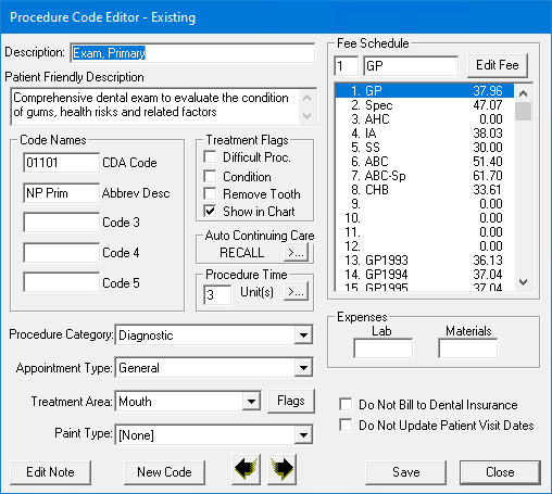 Fee Schedule - You can assign up to 999 fees for each procedure. To learn how to edit the fee schedule of a selected procedure code, click Editing fee schedules.