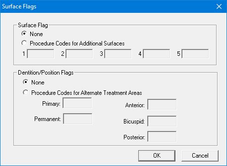 Note: If you select Procedure Codes for Additional Surfaces, you must fill in each of the text fields. For example, if there are only three additional procedure codes, you must repeat the procedure code in text field 3 in text fields 4 and 5 too.