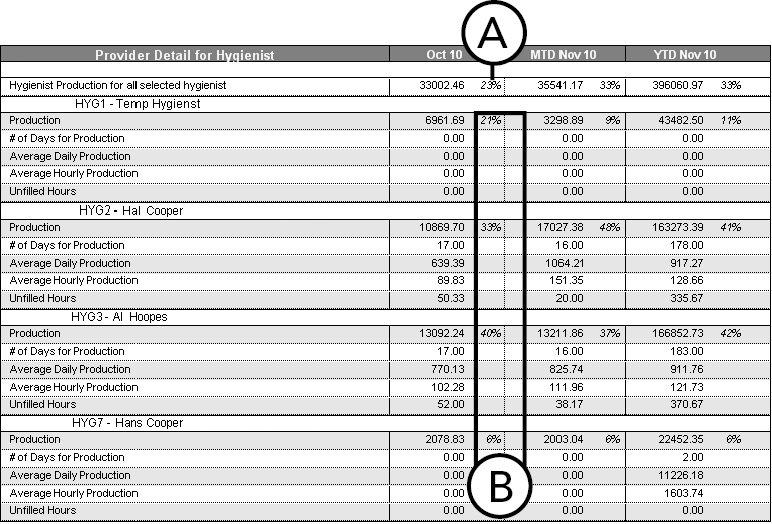 Note: The percentage of all the listed hygienists will add up to 100% because the sum of each hygienist's percentage of production is 100% of the Hygienist Production for all selected hygienists percentage.