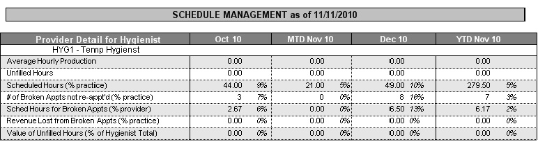 If you selected Include Hygienist Detail for Production and/or Schedule Management when setting up options for the report in the Practice Advisor Report dialog box, the report will include an extra page or pages with the Key Performance Indicators for Production and/or Schedule Management for each hygienist on the report. For details about how to assign providers for and generate the report, see Running the Practice Advisor Report.