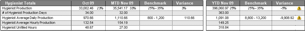 YTD - The Hygienist Production since the beginning of the year (fiscal or calendar). The percentage (%) in this box is the Hygienist Production since the beginning of the year divided by the practice's Production since the beginning of the year.