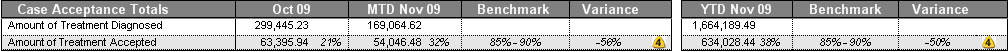 YTD - The Amount of Treatment Accepted since the beginning of the year (fiscal or calendar). The percentage (%) in this box is the Amount of Treatment Accepted since the beginning of the year divided by the Amount of Treatment Diagnosed since the beginning of the year (multiplied by 100 and then rounded to the nearest whole number).