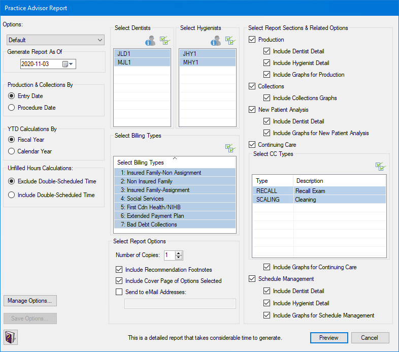 Include Hygienist Detail - Select to generate a report of schedule management information for each of the selected or for all hygienists.