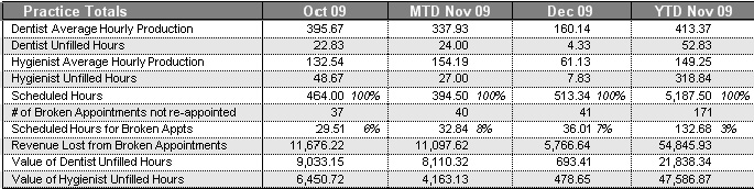 The Revenue Lost from Broken Appointments is the Scheduled Hours for Broken Appts multiplied by the Dentist Average Hourly Production within a given date range.