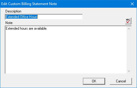 1. From the Maintenance menu in the Office Manager, point to Practice Setup > Custom Notes, and then click Billing Statement Notes Setup.