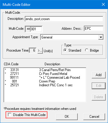 You can disable any multi-code. Disabling a multi-code removes it from the Procedure Code List in the Procedure Codes dialog box in the Appointment Book and the Multi-Codes list in the Enter Procedure(s) dialog box in the Ledger but not from the Multi-Code Setup dialog box or the Dentrix database as deleting a multi-code would.