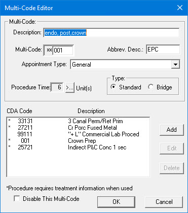 Note: You must assign a unique five-character code to each multi-code. Dentrix automatically assigns "xx" as the first two characters.