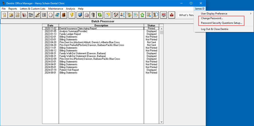 1. From a Dentrix module, click the logged in user’s name on the right side of the menu bar.