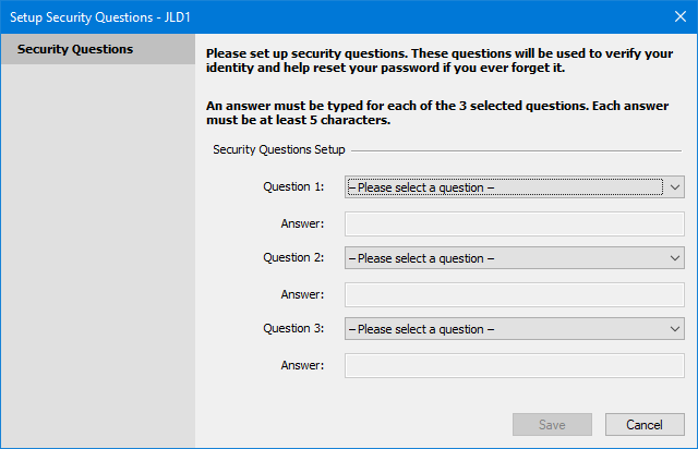6. Select a question from the list for each question, type an answer for each question, and then click Save.