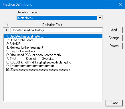 Alert notes allow you to create short note templates that you can add to the patient alert notes. Alert notes can be up to 50 characters in length, and you are limited to a total of 99 alert notes.