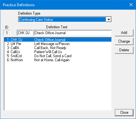To change a continuing care status, select the status that you want to change, replace the abbreviation and description with new ones, and then click Change. To learn more, click Changing a practice definition.