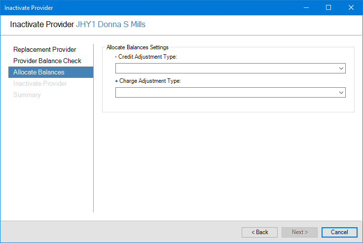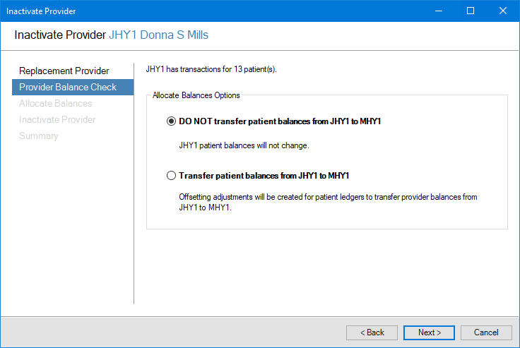 4. Select how you want to handle any balances for the provider you are inactivating, and then click Next.
