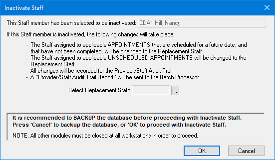 You cannot delete your office staff from the Dentrix database. You can, however, inactivate members of your staff. When you inactivate a member of your staff, you receive a message to choose a replacement. All future and unscheduled appointments that were assigned to the inactivated member of your staff are assigned to his or her replacement.