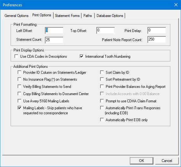 On the Print Options tab of the Preferences dialog box, you can set general printing options that will affect reports printed from Dentrix. These settings will not affect letters since they are printed from Microsoft Word.