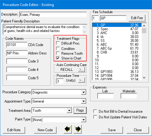 Whether you create your own procedure codes or purchase them, by default every procedure code is listed in the Procedure Codes panel of the Patient Chart. Hiding a procedure code so that the only codes that appear are those that you use most often reduces the size of the list making it easier and faster to add treatment.
