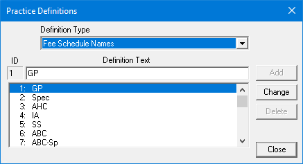 3. To rename a fee schedule, select it, type the new name in the Definition Text box, and then click Change.